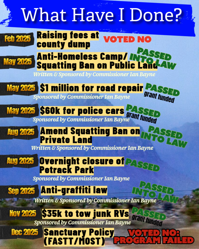 PASSED: November 18, 2025, Ian’s funding (co-sponsored by Commissioner Jabbour) to take $35,000 in federal grant money to tow junk “homeless” RVs/trailers from the desert passed. Watch here